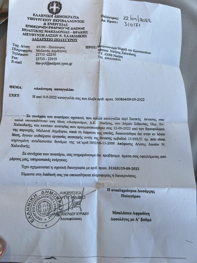 Πρόστιμο 1,5 εκατομμυρίου ευρώ καλείται να πληρώσουν αθροιστικά Δήμος Σιθωνίας (750.000 ευρώ) και η εταιρεία ΥΔΡΟΦΙΛΗ Α.Ε. (ναι εκείνη της υπόθεσης των υδρομέτρων) (άλλα 750.000 ευρώ) για καταπάτηση δασικής έκτασης στην περιοχή Ασπρονερίου για τα έργα αποκατάστασης του ΧΑΔΑ.