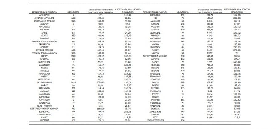 Τα νέα εργαστηριακά επιβεβαιωμένα κρούσματα της νόσου που καταγράφηκαν τις τελευταίες 24 ώρες είναι 10.985 , εκ των οποίων 57 εντοπίστηκαν κατόπιν ελέγχων στις πύλες εισόδου της χώρας. Ο συνολικός αριθμός των κρουσμάτων ανέρχεται σε 2.047.849 (ημερήσια μεταβολή +0.5%), εκ των οποίων 49.8% άνδρες.