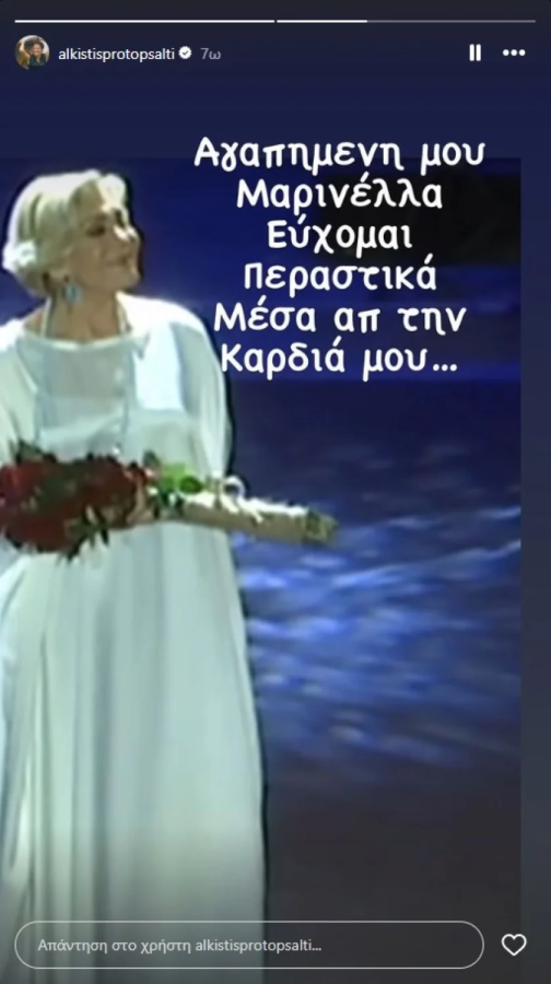 «Αγαπημένη μου Μαρινέλλα εύχομαι περαστικά μέσα από την καρδιά μου», έγραψε σε story που δημοσίευσε η Άλκηστις Πρωτοψάλτη.