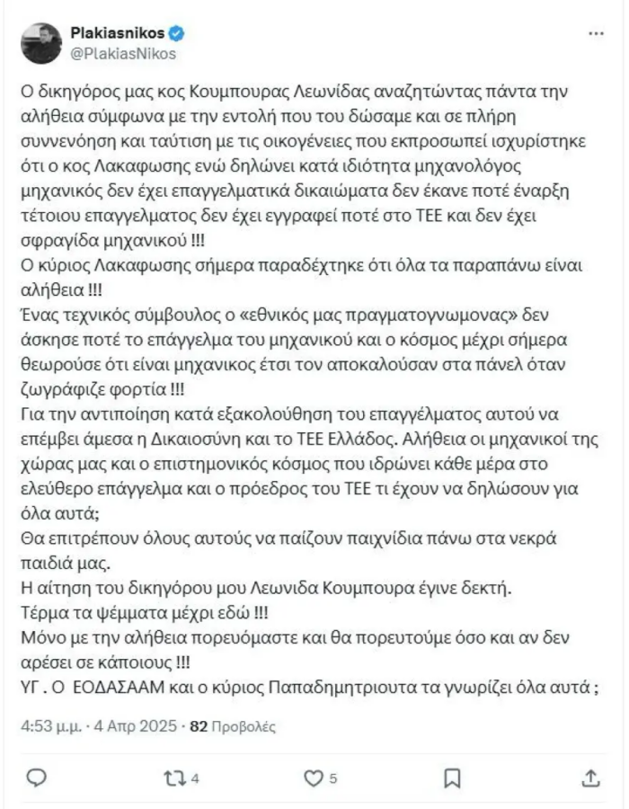 Ο κ. Πλακιάς, που δια του συνηγόρου του κ. Κουμπούρα είχε ζητήσει να εξεταστούν τα επαγγελματικά δεδομένα των εμφανιζόμενων πραγματογνωμόνων, αίτημα που έγινε δεκτό από τη δικαιοσύνη, μετά τη συνέντευξη του κ.Λακαφώση, ζητά την παρέμβαση της δικαιοσύνης για αντιποίηση επαγγέλματος κατ’ εξακολούθηση, την παρέμβαση του ΤΕΕ, ενώ ζητά να σταματήσουν τα παιχνίδια «πάνω στα νεκρά παιδιά μας».