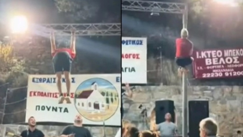 Ο ίδιος σκαρφάλωσε στους στύλους με τα φώτα και έκανε… μονόζυγο, ενώ οι θαμώνες παρακολουθούσαν έκπληκτοι.