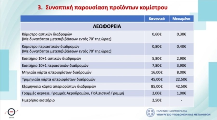 - Οι δικαιούχοι μειωμένου κομίστρου καταβάλλουν το 50% των ανωτέρω ποσών εκτός του ημερησίου εισιτηρίου