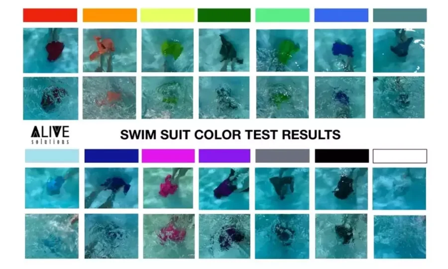 Η εταιρεία Alive Solutions τέσταρε πόσο ορατά είναι διάφορα χρώματα μαγιό σε πισίνα με ανοιχτόχρωμο πυθμένα. Η επάνω φωτογραφία σε κάθε ενότητα δείχνει το ύφασμα κάτω από την επιφάνεια του νερού και η κάτω το ύφασμα όταν υπάρχει κυματισμός στην επιφάνεια του νερού. Για περισσότερες πληροφορίες, μπορείτε να επισκεφθείτε τα social media της Alive Solutions @aquaticsafetyconnection.