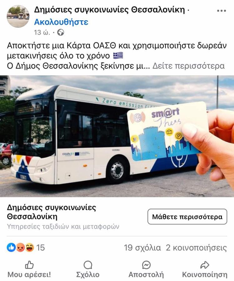 Συγκεκριμένα, πρόκειται για τη σελίδα «Δημόσιες συγκοινωνίες Θεσσαλονίκη», η οποία κάνει λόγο για κάρτες ΟΑΣΘ για δωρεάν μετακινήσεις όλο το χρόνο με αστικά λεωφορεία χρησιμοποιώντας μάλιστα παραπλανητικά και το όνομα του Δήμου Θεσσαλονίκης.