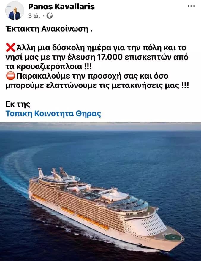 «Άλλη μια δύσκολη ημέρα για την πόλη και το νησί μας με την έλευση 17.000 επισκεπτών από τα κρουαζιερόπλοια. Παρακαλούμε την προσοχή σας και όσο μπορούμε ελαττώνουμε τις μετακινήσεις μας!», αναφέρεται στην ανακοίνωση που απευθύνεται στους κατοίκους της Σαντορίνης, η οποία υπογράφεται από την «Τοπική Κοινότητα Θήρας» και την ανέβασε στο Facebook ο δημοτικός σύμβουλος Πάνος Καβαλλάρης.