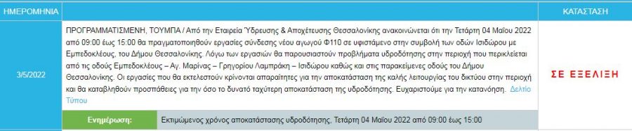 Από την Εταιρεία Ύδρευσης & Αποχέτευσης Θεσσαλονίκης ανακοινώνεται ότι αύριο, Τετάρτη 04 Μαΐου 2022 από 09:00 έως 15:00 θα πραγματοποιηθούν εργασίες σύνδεσης νέου αγωγού Φ110 σε υφιστάμενο στην συμβολή των οδών Ισιδώρου με Εμπεδοκλέους, του Δήμου Θεσσαλονίκης.