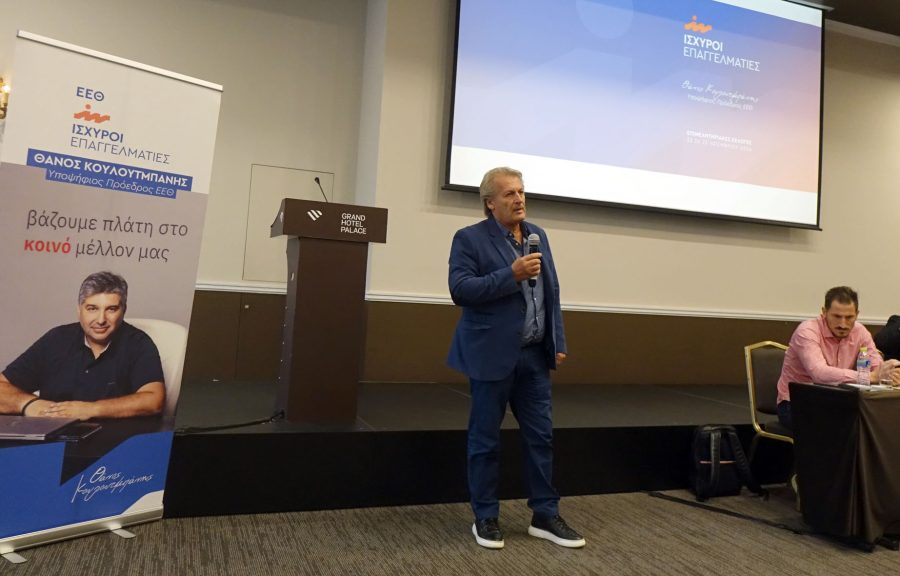 Σύνθημα νίκης στις εκλογές του Επαγγελματικού Επιμελητηρίου Θεσσαλονίκης έδωσε από κεντρικό ξενοδοχείο της πόλης ο υποψήφιος πρόεδρος του ΕΕΘ, Θάνος Κουλουτμπάνης, σε συνάντηση του συνδυασμού «Ισχυροί Επαγγελματίες» του οποίου ηγείται.