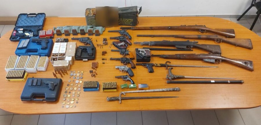 Ειδικότερα, σε έρευνα που πραγματοποιήθηκε σε οικία όπου διαμένει η συλληφθείσα στην παραπάνω περιοχή, παρουσία δικαστικού λειτουργού, βρέθηκαν και κατασχέθηκαν:-5- πιστόλια,-8- περίστροφα,-4- πολεμικά τυφέκια,-1- αεροβόλο πιστόλι, -1.658- φυσίγγια διαφόρων διαμετρημάτων, -4- κάλυκες,-2- ξιφολόγχες καισπαθί.
