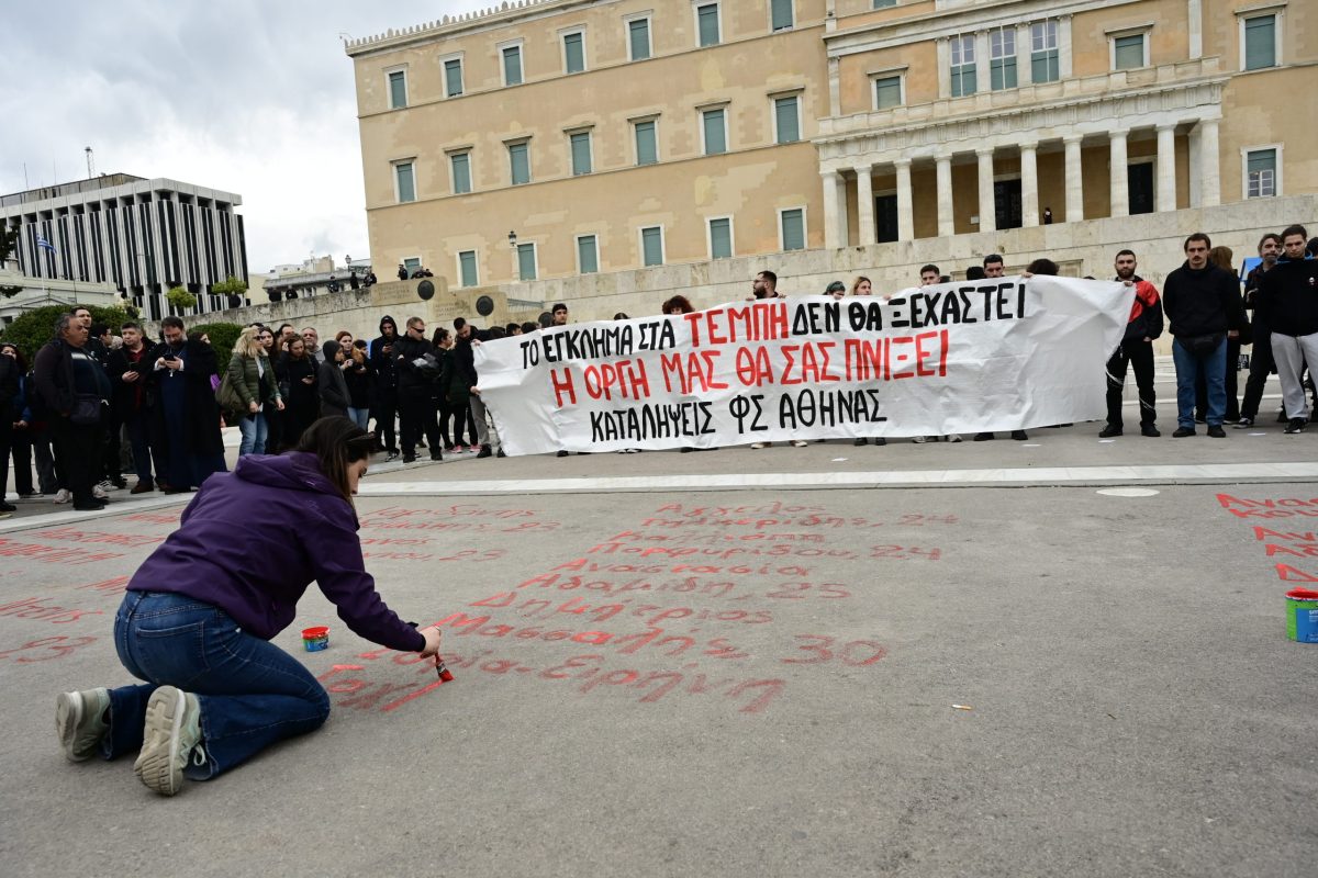 Συγκεκριμένα, έγραψαν τα ονόματα των 57 θυμάτων του δυστυχήματος των Τεμπών με κόκκινη μπογιά έξω από τη Βουλή διαδηλωτές, στο πλαίσιο των συγκεντρώσεων για την πανελλαδική απεργία, έναν χρόνο μετά την πολύνεκρη σιδηροδρομική τραγωδία.