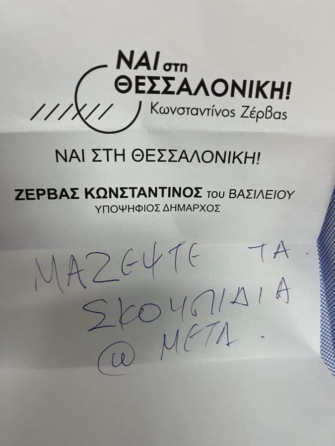 Ένας αγανακτισμένος Θεσσαλονικιός εξέφρασε τα παράπονα του για τα σκουπίδια που έχουν γίνει βουνά στις γειτονιές του δήμου πάνω στο ψηφοδέλτιο του πρώην δημάρχου Κωνσταντίνου Ζέρβα.
