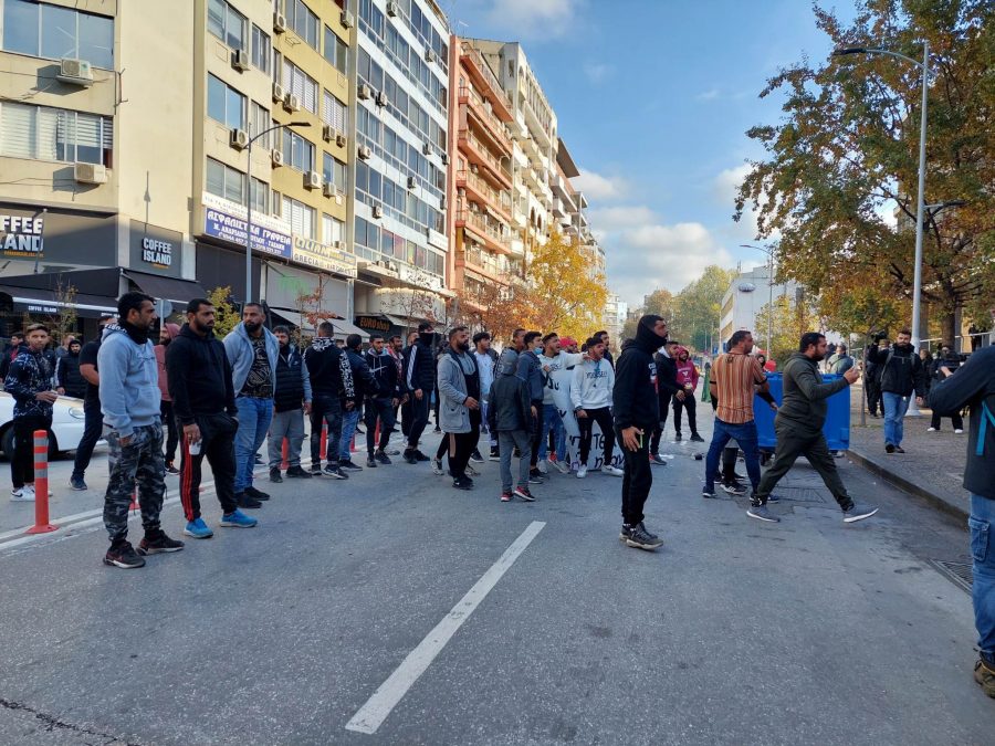 Οι συγκεντρωμένοι φώναξαν συνθήματα και στη συνέχεια εκτόξευσαν αντικείμενα κατά των αστυνομικών.