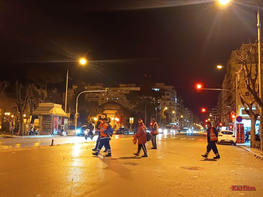Μετά την λήξη των επεισοδίων στη διάρκεια της αποψινής πορείας για την τραγωδία στα Τέμπη, οι εργαζόμενοι του δήμου Θεσσαλονίκης ήταν επί ποδός, ώστε να αποκαταστήσουν την εικόνα του κέντρου που είχε μετατροπή σε «πεδίο μάχης». Οι εργαζόμενοι του δήμου ξεκίνησαν να καθαρίζουν τους δρόμους από τα σπασμένα μπουκάλια και τα υπόλοιπα απορρίμματα.