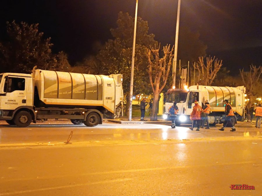 Έπιασαν δουλειά οι εργαζόμενοι του τομέα καθαριότητας του δήμου Θεσσαλονίκης μετά τα επεισόδια.