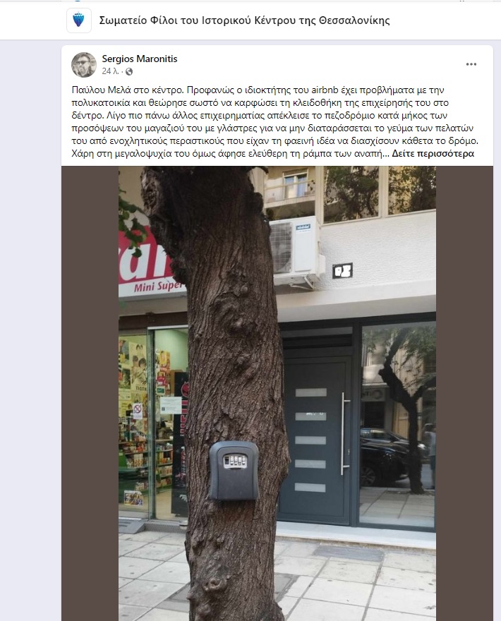 Ένας ιδοκτήτης σπιτιού προς ενοικίαση τοποθέτησε την κλειδωθήκη στο κορμό ενός δέντρου…Όπως υποστηρίζει ο ίδιος, το περιστατικό συνέβη στην οδό Παύλου Μελά, στο κέντρο της πόλης.