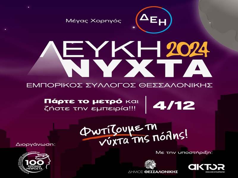 Ο Εμπορικός Σύλλογος Θεσσαλονίκης σε συνεργασία με το Δήμο Θεσσαλονίκης, διοργανώνει την Τετάρτη 4 Δεκεμβρίου 2024, τη μεγαλύτερη γιορτή της πόλης, τη Λεύκη Νύχτα. Τα καταστήματα θα παραμείνουν ανοιχτά μέχρι τα μεσάνυχτα.