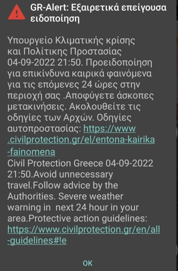 «Προειδοποιητικό μήνυμα για το επόμενο 24ωρο για επικίνδυνα καιρικά φαινόμενα στην περιοχή σας. Αποφύγετε τις άσκοπές μετακινήσεις κατά τη διάρκεια των έντονων φαινομένων και ακολουθείστε τις οδηγίες των Αρχών».