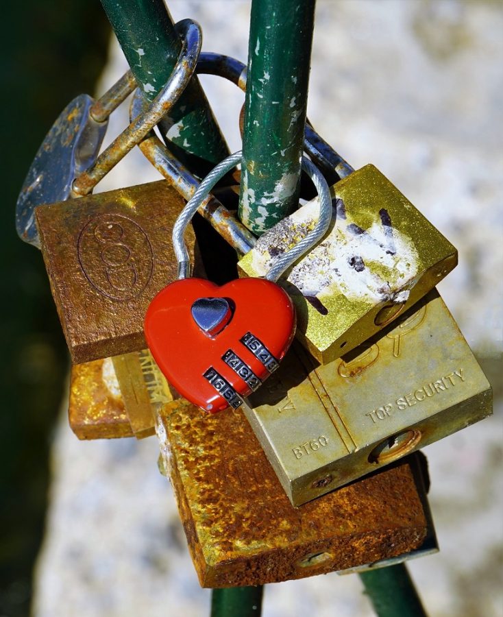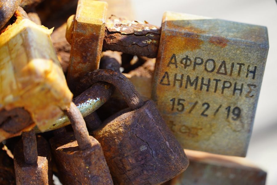 Μια κλειδαριά με έντονη προσωπικότητα, παρά την προχωρημένη «σήψη» της είναι αυτή που από τον λαιμό της κρέμεται ένας κρίκος κι από αυτόν κρέμονται δύο μεταλλικές καρδούλες, επίσης σκουριασμένες. Εικόνα που προκαλεί τρυφερότητα μα και συγκίνηση.