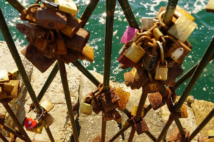 Δεκάδες κλειδαριές, κάθε είδους, σχήματος και χρώματος, έχουν κρεμαστεί στα προστατευτικά κάγκελα που έχουν τοποθετηθεί γύρω από σκάλες που οδηγούν στο ύψος της θάλασσας και προσφέρουν ένα ενδιαφέρον θέαμα στους διερχόμενους, ντόπιους και επισκέπτες.