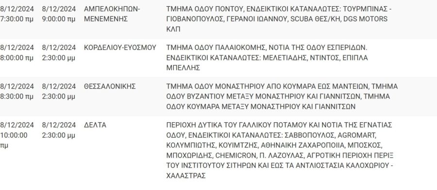 Διακοπές ρεύματος θα σημειωθούν σήμερα, (8/12) σε τέσσερις δήμους της Θεσσαλονίκης.