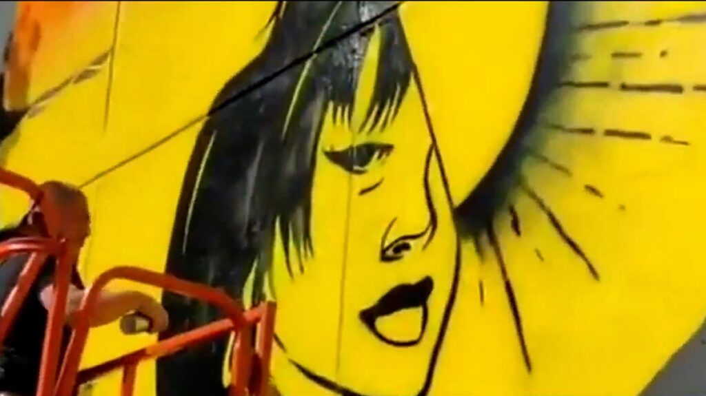 Στο γκράφιτι απεικονίζεται το πρόσωπο μιας κοπέλας από το οποίο ανατέλλει ο ήλιος, ένα τρένο που εξέρχεται από ένα τούνελ, όπως εκείνο των Τεμπών και ταξιδεύει δίπλα στο ποτάμι με κατεύθυνση το άγνωστο. Στο διάβα του στέκει αγέρωχο ένα δέντρο απ’ όπου πετούν χελιδόνια, μέσα σε ένα πύρινο ηλιοβασίλεμα.