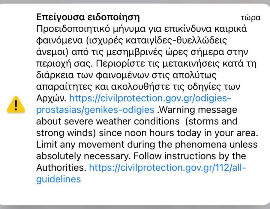 Όπως αναφέρει το μήνυμα, «Προειδοποιητικό μήνυμα για επικίνδυνα καιρικά φαινόμενα (ισχυρές καταιγίδες-θυελλώδεις άνεμοι) από τις μεσημβρινές ώρες σήμερα στην περιοχή σας. Περιορίστε τις μετακινήσεις κατά τη διάρκεια φαινομένων στις απολύτως απαραίτητες και ακολουθήστε τις οδηγίες των αρχών».
