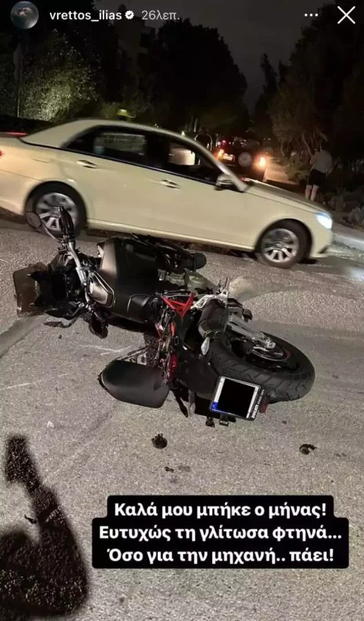 «Καλά μου μπήκε ο μήνας! Ευτυχώς τη γλίτωσα φτηνά… όσο για τη μηχανή… πάει!», έγραψε στο μήνυμά του ο Ηλίας Βρεττός.