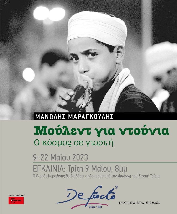 Έναν «κόσμο σε γιορτή», τον κόσμο των Μούλεντ της Αιγύπτου, όπου η παράδοση συναντά τη θρησκεία και την κάθαρση, αποτύπωσε με τον φωτογραφικό του φακό ο Μανώλης Μαραγκούλης και τον παρουσιάζει μέσα από 20 διαφορετικά φωτογραφικά καρέ, στην έκθεση «Μούλεντ για ντούνια/Ο κόσμος σε γιορτή», που εγκαινιάζεται την Τρίτη 9 Μαΐου, στις 20.00, στο εμβληματικό καφέ-μπαρ De Facto (Π. Μελά 19).