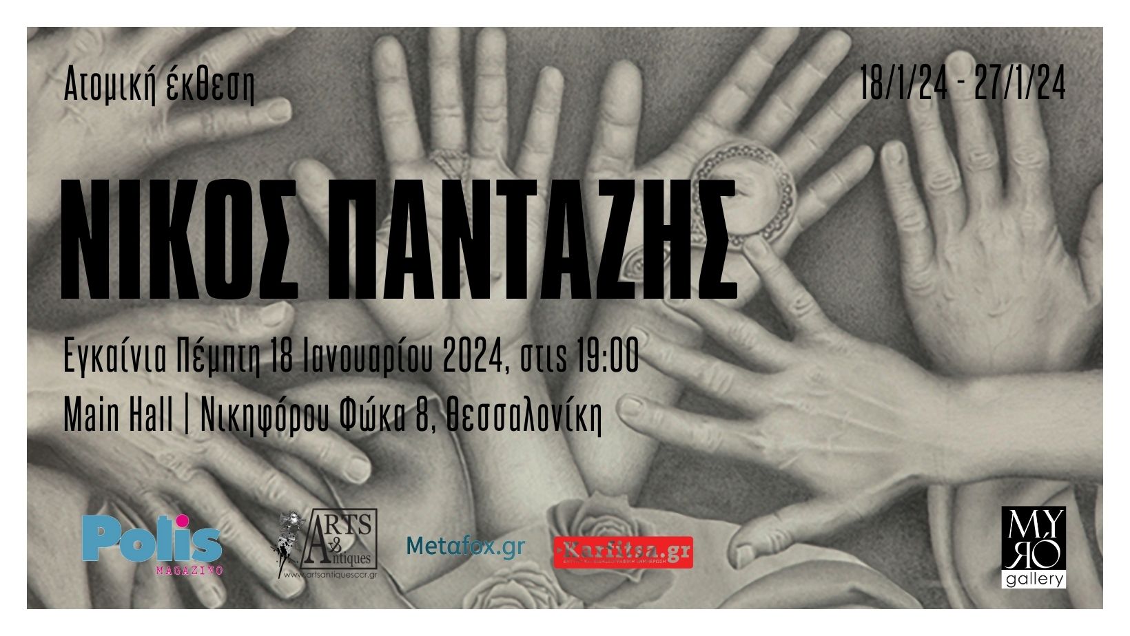 Η Myro Gallery ανακοινώνει την επερχόμενη ατομική έκθεση του Νίκου Πανταζή θα λάβει χώρα την Πέμπτη, 18 Ιανουαρίου 2024, στις 19:00, και θα παραμείνει ανοικτή για το κοινό μέχρι το Σάββατο, 27 Ιανουαρίου 2024, στην Myro Gallery (Νικηφόρου Φωκά 8, Θεσσαλονίκη).