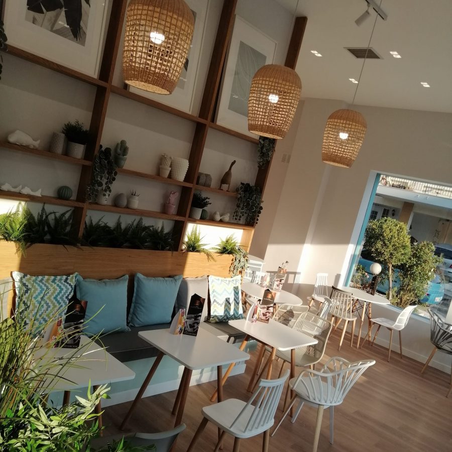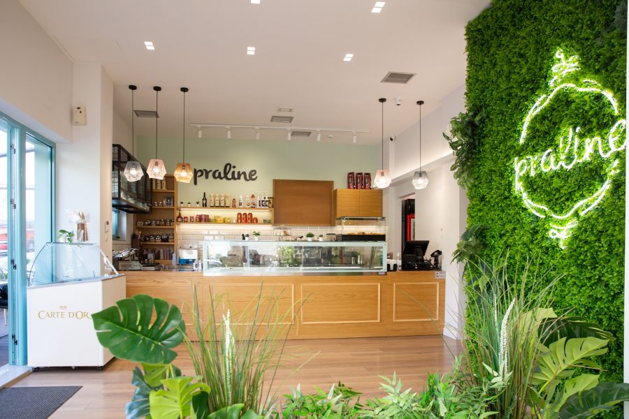 Η διακόσμηση του «Praline» είναι μοντέρνα και βασίζεται σε ήπιους τόνους χρωμάτων, όπως είναι το άσπρο, το γκρι και το γαλάζιο, καθώς και στο ξύλινο στοιχείο που προσφέρει ένα πιο chic ύφος στο μαγαζί. Δεν λείπει, φυσικά, το στοιχείο της φύσης, με τις όμορφες λεπτομέρειες των διακοσμητικών φυτών να «φωτίζουν» τον χώρο. Τα μικρά μαξιλαράκια στους καναπέδες αποπέμπουν σε ένα πιο οικείο κλίμα, ενώ ταυτόχρονα οι λιχουδιές που προσφέρει το «Praline» μαγεύουν μικρούς και μεγάλους!