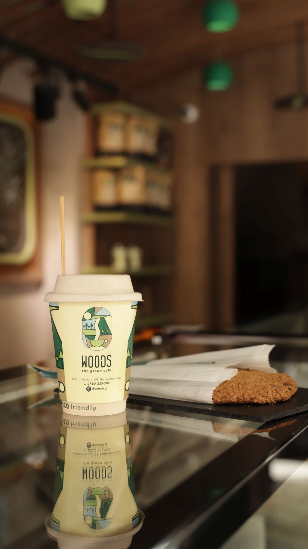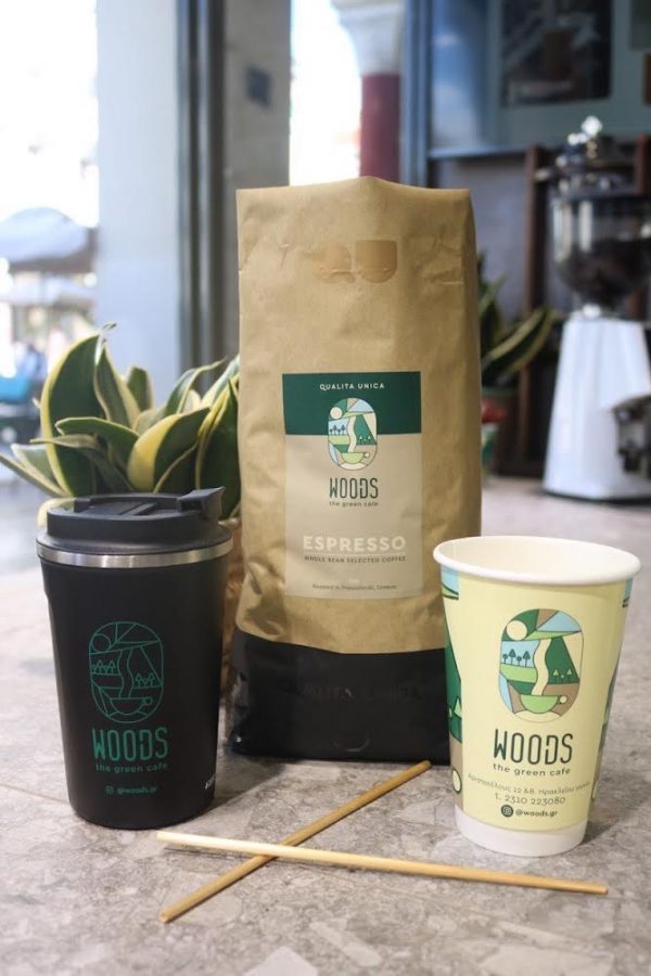 Βασικό «πράσινο» χαρακτηριστικό του μαγαζιού είναι οι οικολογικές συσκευασίες που χρησιμοποιεί για την παρασκευή του καφέ. Το ποτήρι από μπαμπού αντί για χαρτί, το καλαμάκι από σιτάρι και το καπάκι «πιπίλα» από ζαχαροκάλαμο, εκτός από τα περιβαλλοντικά οφέλη που έχουν κρατούν την ποιότητα του ροφήματος όπως αντίστοιχα θα έκανε ένα πλαστικό κύπελλο ή καλαμάκι.