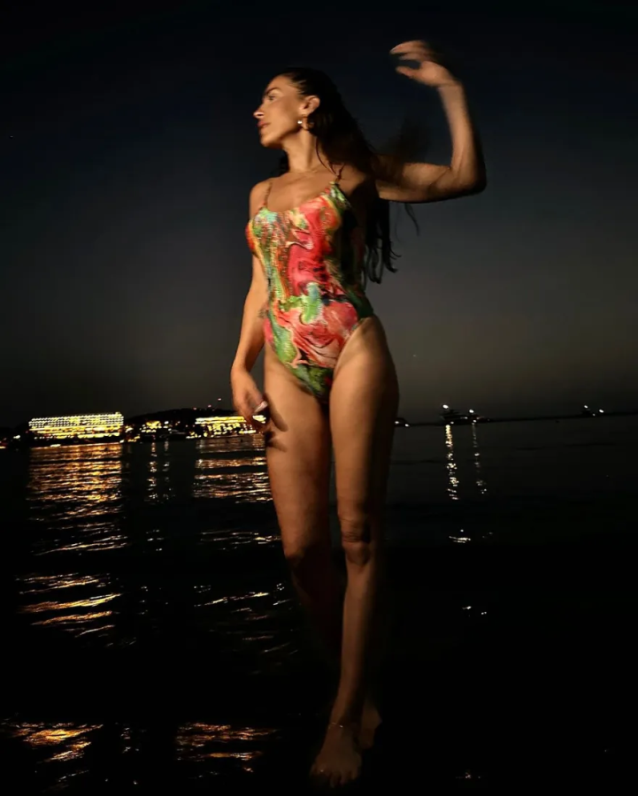 Στις φωτογραφίες που ανάρτησε στον προσωπικό της λογαριασμό στο Instagram, ποζάρει με ένα χρωματιστό ολόσωμο μαγιό, ενώ πίσω της τα φώτα αντανακλούν στη θάλασσα.