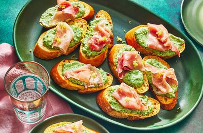 Μικρές φέτες ψωμιού, ρόδι, φέτα και φρέσκος βασιλικός. Ένα snack εύκολο, γιορτινό και πολύχρωμο, ιδανικό για να ξεκινήσει το πάρτι με στυλ.