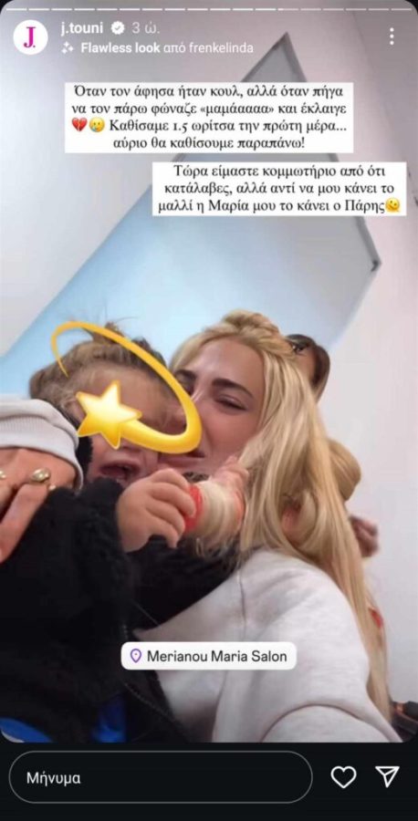 Η influencer άφησε τον γιο της για περίπου μιάμιση ώρα στο νηπιαγωγείο, ενώ, όπως έγραψε σε νέα ανάρτηση, αύριο πρόκειται να τον αφήσει λίγο παραπάνω, ώστε σιγά σιγά να αρχίσει να προσαρμόζεται.