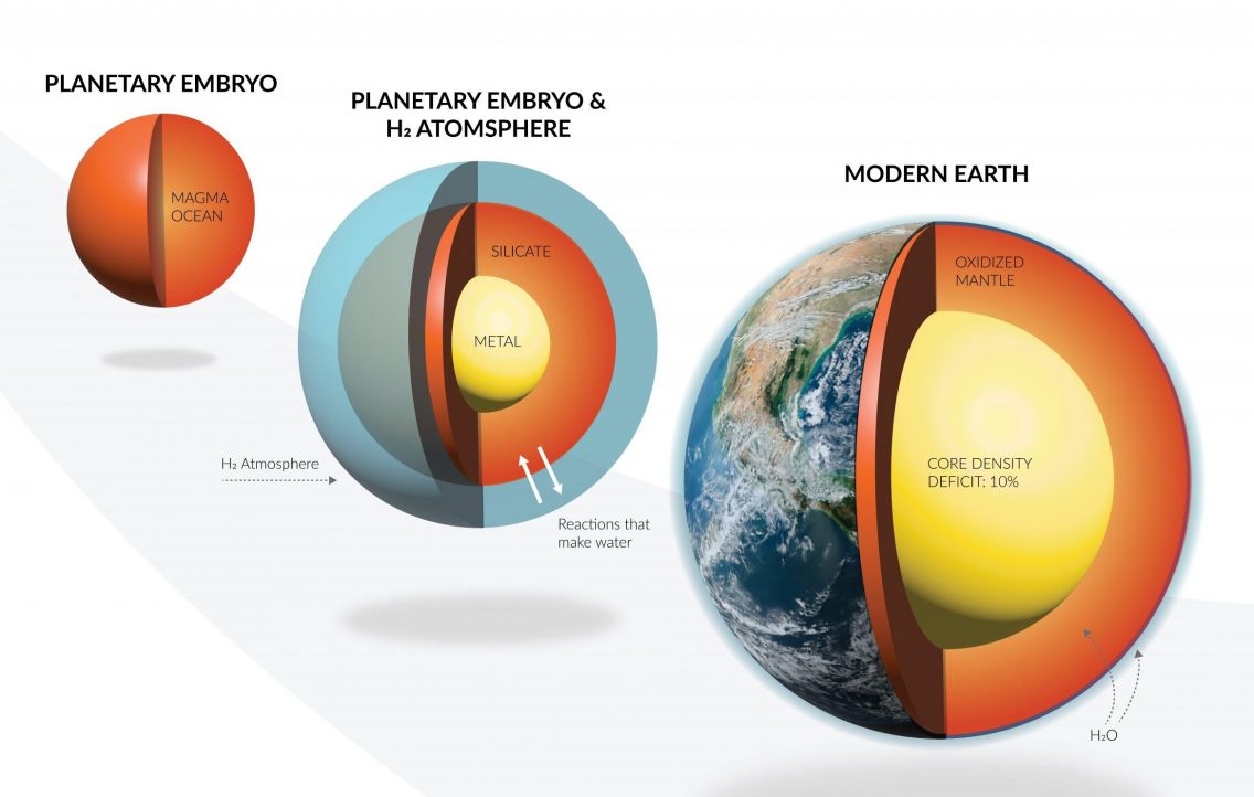 Χρησιμοποιώντας ένα νέο μοντέλο, οι ερευνητές του Ινστιτούτου για την Επιστήμη Κάρνεγκι στις ΗΠΑ και του Πανεπιστημίου της Καλιφόρνιας (UCLA) μπόρεσαν να αποδείξουν ότι στις αρχές της ύπαρξης της Γης, οι αλληλεπιδράσεις μεταξύ του ωκεανού μάγματος και μιας πρωτο-ατμόσφαιρας μοριακού υδρογόνου θα μπορούσαν να έχουν προκαλέσει ορισμένα από τα χαρακτηριστικά της Γης, όπως η αφθονία νερού. Οι αλληλεπιδράσεις αυτές στην προσομοίωση της εμβρυικής Γης είχαν ως αποτέλεσμα την κίνηση μεγάλων μαζών υδρογόνου στον μεταλλικό πυρήνα, την οξείδωση του μανδύα και την παραγωγή μεγάλων ποσοτήτων νερού.