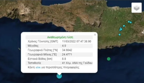 Συγκεκριμένα, το επίκεντρο του σεισμού εντοπίστηκε στα 41 χιλιόμετρα νότια νοτιοανατολικά της Γαύδου. Το εστιακό βάθος ήταν στα 8,8 χιλιόμετρα.