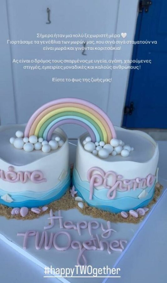 «Σήμερα ήταν μια πολύ ξεχωριστή ημέρα. Γιορτάσαμε τα γενέθλια των μωρών μας, που σιγά σιγά σταματούν να είναι μωρά και γίνονται κοριτσάκια! Ας είναι ο δρόμος τους σπαρμένος με υγεία, αγάπη, χαρούμενες στιγμές, εμπειρίες μοναδικές και καλούς ανθρώπους. Είστε το φως της ζωής μας!».