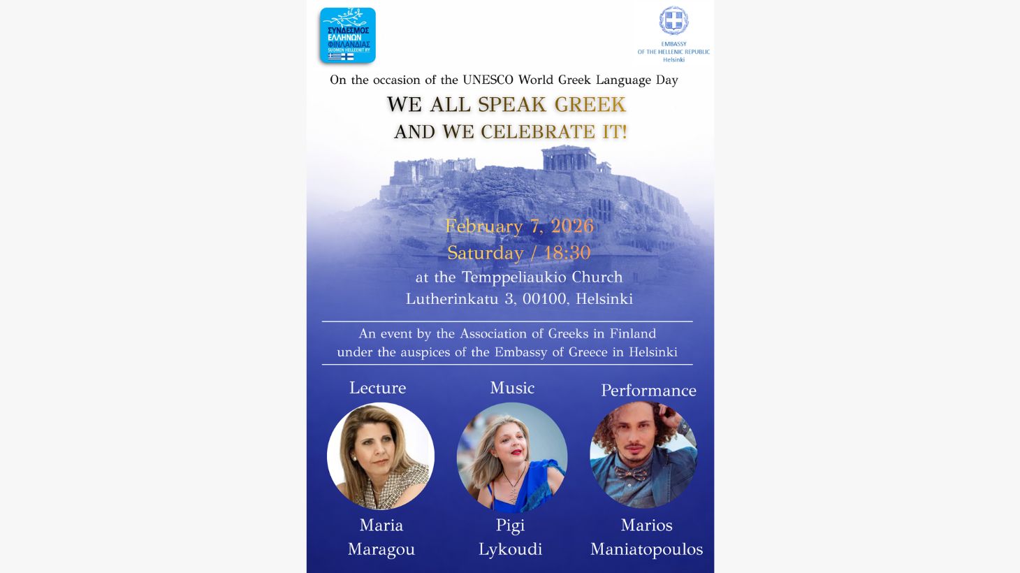 Με αφορμή τον εορτασμό της Παγκόσμιας Ημέρας Ελληνικής Γλώσσας (9 Φεβρουαρίου), ο Σύνδεσμος Ελλήνων Φινλανδίας, το Ευρωπαϊκό Σχολείο και η Ελληνική Πρεσβεία στο Ελσίνκι διοργανώνουν ένα διήμερο λόγου και μουσικής, αφιερωμένο στην άσβεστη φλόγα του Έλληνος Λόγου που με ιερό του όχημα την Ελληνική Γλώσσα, επιμένει μέσα στο διάβα των χιλιετηρίδων να φωτίζει και να διδάσκει στον άνθρωπο την συμπαντική Σοφία.