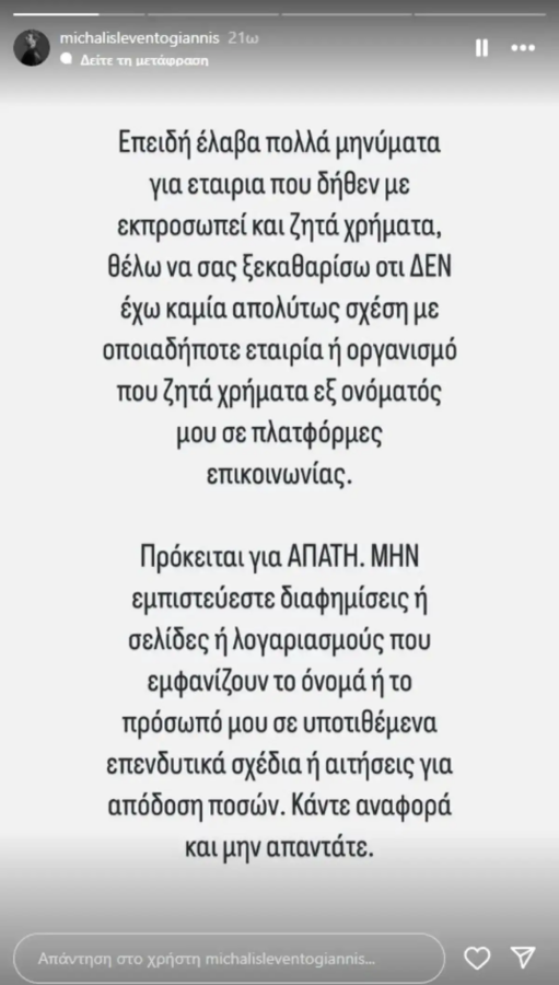 «Επειδή έλαβα πολλά μηνύματα για εταιρεία που δήθεν με εκπροσωπεί και ζητά χρήματα, θέλω να σας ξεκαθαρίσω ότι ΔΕΝ έχω καμία απολύτως σχέση με οποιαδήποτε εταιρεία ή οργανισμό που ζητά χρήματα εξ’ ονόματός μου σε πλατφόρμες επικοινωνίας.