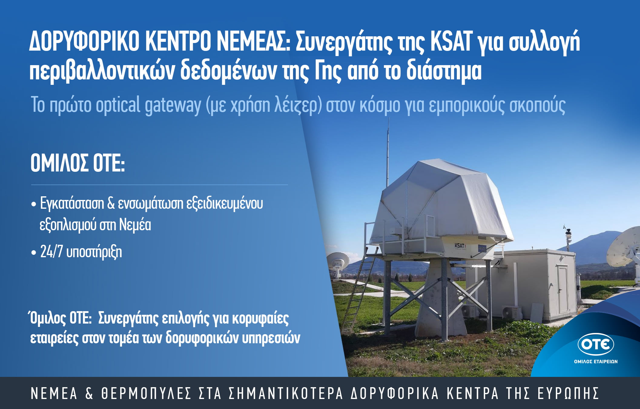 To Κέντρο Δορυφορικών Επικοινωνιών του Ομίλου ΟΤΕ στη Νεμέα επέλεξε η Kongsberg Satellite Services (KSAT), κορυφαίος πάροχος δορυφορικών υπηρεσιών και γεωσκόπησης, ώστε να εγκαταστήσει την πρώτη στο είδος της υποδομή με κεραία που συλλέγει δεδομένα από δορυφόρους (Optical Gateway) μέσω οπτικού σήματος (λέιζερ), για εμπορικούς σκοπούς. Μέσα από αυτή την state-of-the-art υποδομή, η KSAT θα διαθέτει δεδομένα και φωτογραφίες της γης σε οργανισμούς παγκόσμιου βεληνεκούς που ασχολούνται με τη διαχείριση και παρακολούθηση περιβαλλοντικών δεδομένων.