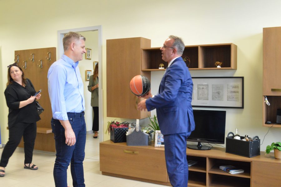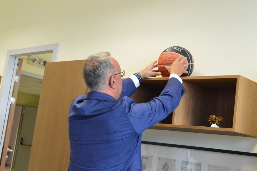 Ιδιαίτερο ενδιαφέρον επέδειξε ο υπουργός Υποδομών-Μεταφορών Χρήστος Σταϊκούρας, στο περιθώριο  των συναντήσεων  που  έγιναν το προηγούμενο διάστημα για το Δυτικό Προαστιακό Σιδηρόδρομο με φορείς  της πόλης, στο γραφείο του Αντιπεριφερειάρχη Θεσσαλονίκης, Κ. Γιουτίκα, για μια μπάλα  του μπάσκετ, που ο Αντιπεριφερειάρχης  έχει σε περίοπτη θέση στο γραφείο του. Είναι  δώρο από τον Π.Σ.Α.Κ.Κ. με υπογραφές – αυτόγραφα γνωστών Ελλήνων καλαθοσφαιριστών.