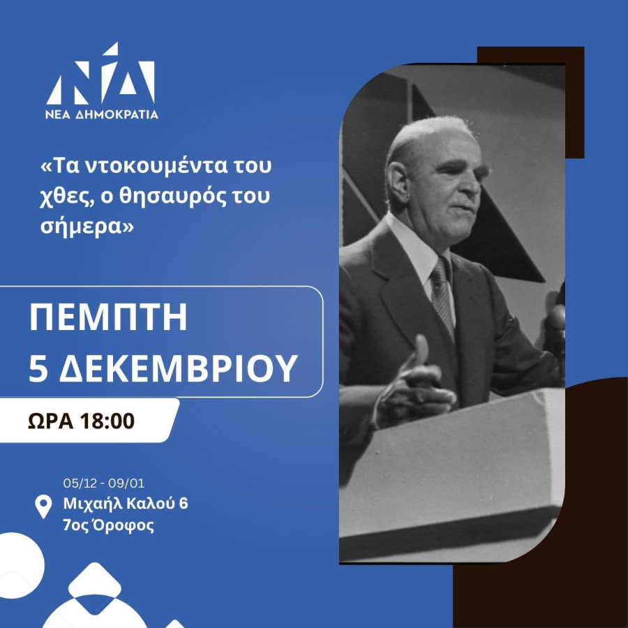 Την  Πέμπτη 5 Δεκεμβρίου στις 18:00 θα πραγματοποιηθούν τα εγκαίνια της έκθεσης ιστορικών ντοκουμέντων με τίτλο: «Τα ντοκουμέντα του χθες, ο θησαυρός του σήμερα» που διοργανώνει η Διοικούσα Επιτροπή Νέας Δημοκρατίας Νομού Θεσσαλονίκης, με αφορμή τα 50 χρόνια από την ίδρυση του κόμματος.