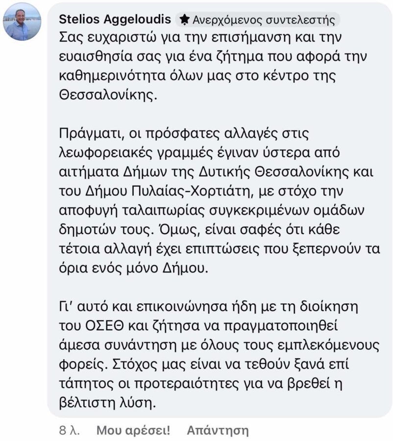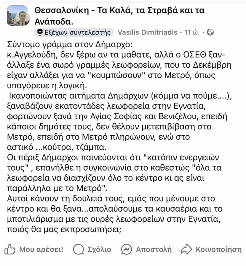 Τον τρόπο αυτό επέλεξε και ένας δημότης προκειμένου να εκφράσει το παράπονο του προς τον Στέλιο Αγγελούδη αναφορικά με τις αλλαγές στις λεωφορειακές γραμμές που «μπουκώνουν» ξανά την οδό Εγνατία, παρά τη λειτουργία του Μετρό.