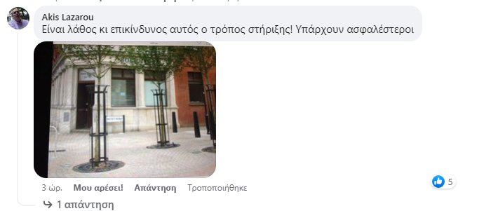 Σύμφωνα με τον κ. Λαζάρου: «Είναι λάθος κι επικίνδυνος αυτός ο τρόπος στήριξης! Υπάρχουν ασφαλέστεροι», είπε αναφερόμενος στα δέντρα, ενώ από κάτω παρέθεσε φωτογραφία για το πώς θα έπρεπε να στηρίζονται.