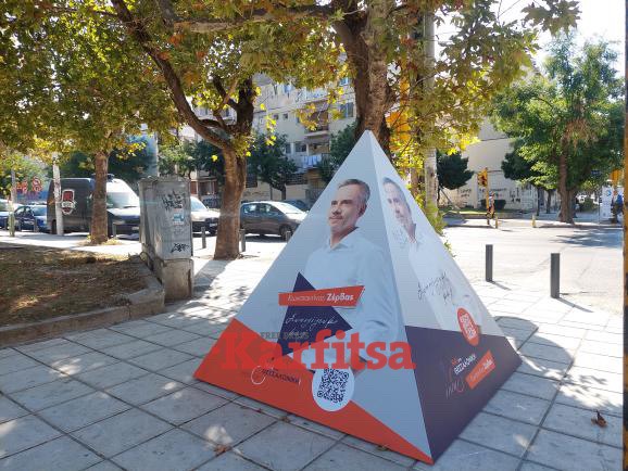 Ο Κωνσταντίνος Ζέρβας τοποθέτησε άλλο ένα μπάνερ σε σχήμα πυραμίδα – μπάνερ σε κεντρικό σημείο, πάνω στο πεζοδρόμιο, κλείνοντας ένα μεγάλο μέρος του.