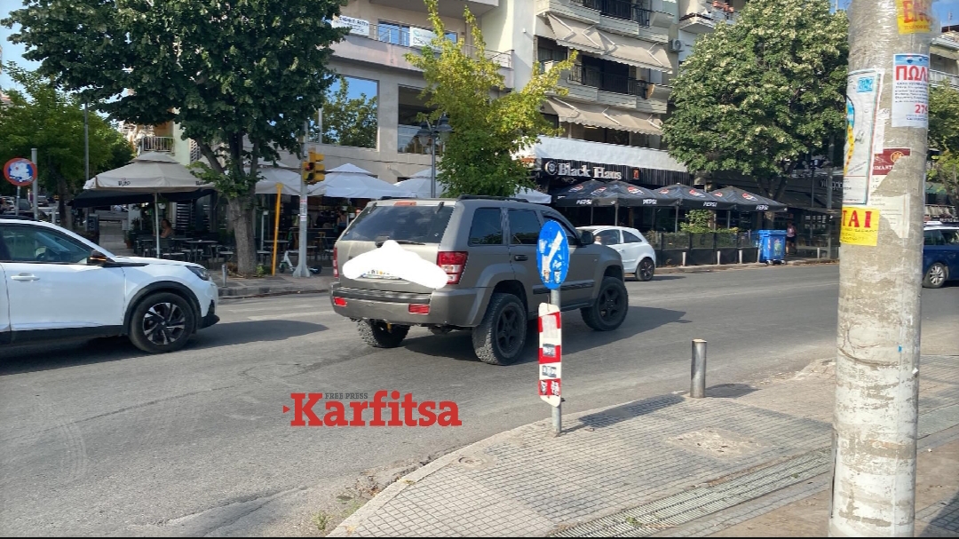Οδηγοί και περαστικοί στην οδό Λαμπράκη με Κλεάνθους γωνία αναρωτιόταν τι συμβαίνει όταν αντίκρισαν ένα ακινητοποιημένο τζιπ στη μέση του δρόμου.