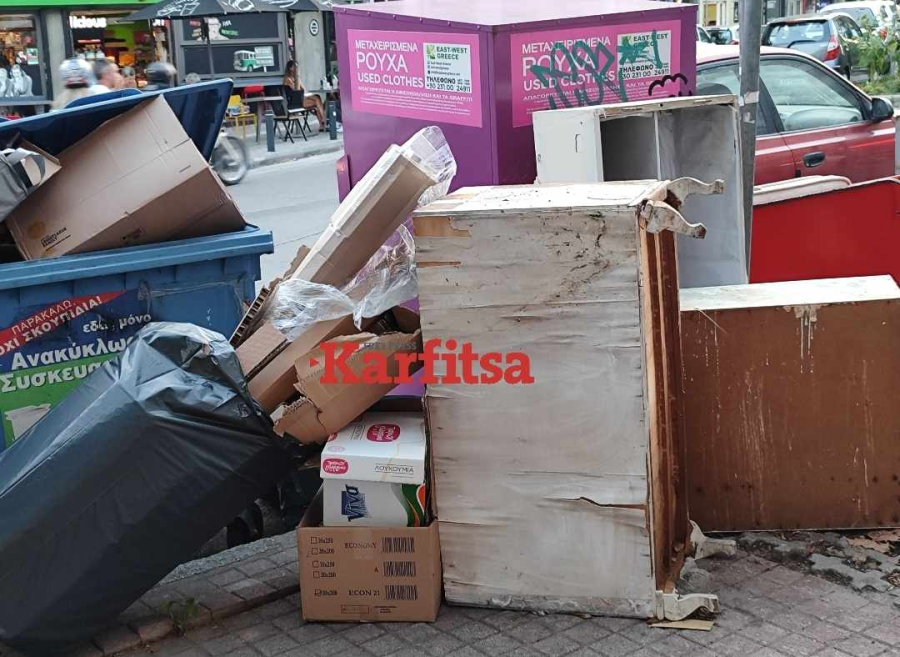 Την ίδια στιγμή οι κάδοι ανακύκλωσης πίσω από τα έπιπλα, φαίνονται γεμάτοι, λες και έχουν να τους αδειάσουν μέρες!