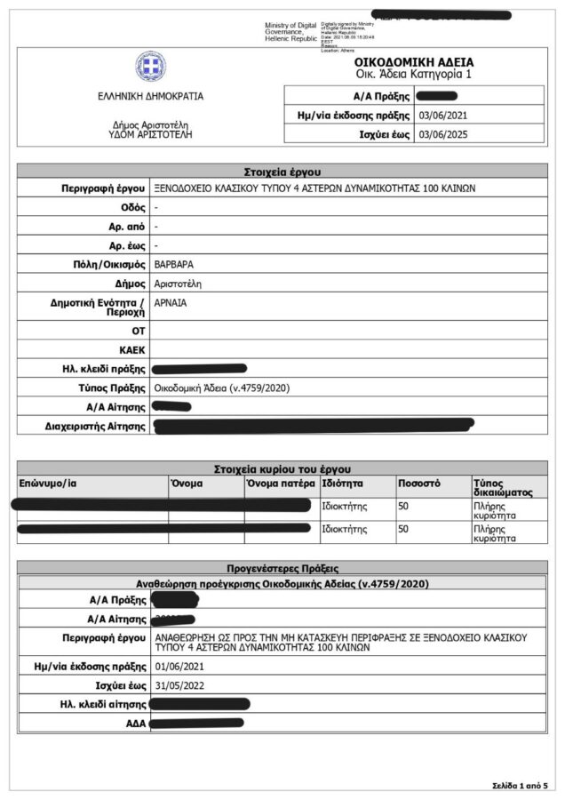 Η άδεια είχε εκδοθεί το 2021 από την Υπηρεσία Δόμησης του Δήμου Αριστοτέλη για οικόπεδο 10,5 στρεμμάτων και προέβλεπε την ανέγερση ξενοδοχείου δυναμικότητας 100 κλινών. Το έργο, βουλγαρικών επιχειρηματικών συμφερόντων, προχώρησε γρήγορα, εντάχθηκε σε αναπτυξιακό νόμο και συνοδεύτηκε από τραπεζική χρηματοδότηση εκατομμυρίων. Σήμερα, όμως, με την απόφαση του Εφετείου, το συγκρότημα θεωρείται αυθαίρετο και απειλείται με διακοπή εργασιών και διοικητικά μέτρα.