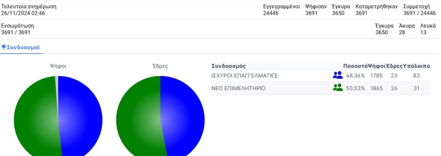 Ο συνδυασμός «ΝΕΟ ΕΠΙΜΕΛΗΤΗΡΙΟ» του Κυριάκου Μερελή νίκησε τον συνδυασμό «Ισχυροί επαγγελματίες» του Θάνου Κουλουτμπάνη με 50,53% έναντι 48,36%.