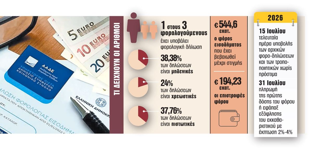 Η ακτινογραφία των φορο-δηλώσεων που έχουν υποβληθεί μέχρι στιγμής δείχνει ότι πάνω από επτά στους δέκα φορολογούμενους είτε δεν πληρώνουν καθόλου φόρο είτε έχουν επιστροφή φόρου για τα εισοδήματα που απέκτησαν το 2025. Μία στις 4 δηλώσεις βγαίνει χρεωστική με τους φορολογούμενους να έχουν ήδη πάρει την «κρυάδα» του εκκαθαριστικού καθώς ο μέσος πρόσθετος φόρος που καλούνται να πληρώσουν αγγίζει τα 1.000 ευρώ.