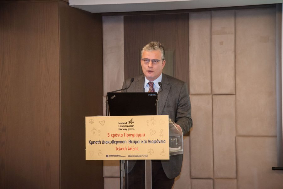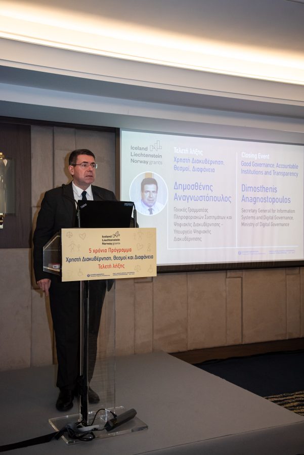 Ο Γενικός Γραμματέας Πληροφοριακών Συστημάτων και Ψηφιακής Διακυβέρνησης – Υπουργείο Ψηφιακής Διακυβέρνησης, κ. Δημοσθένης Αναγνωστόπουλος αφού ευχαρίστησε τις Δότριες χώρες και όλους τους συμμετέχοντες στην υλοποίηση του προγράμματος, τόνισε μεταξύ άλλων ότι η εμπιστοσύνη στους θεσμούς είναι το ζητούμενο και μέσω του προγράμματος αυτή ενισχύθηκε σε σημαντικό βαθμό. Στάθηκε ιδιαίτερα στο θέμα της λογοδοσίας και διαφάνειας λέγοντας ότι το πρόγραμμα πέτυχε την ενίσχυση του διαλόγου μεταξύ πολιτών και Δημοσίου, με συνεπακόλουθο την αύξηση της εμπιστοσύνης των πρώτων προς το δεύτερο.